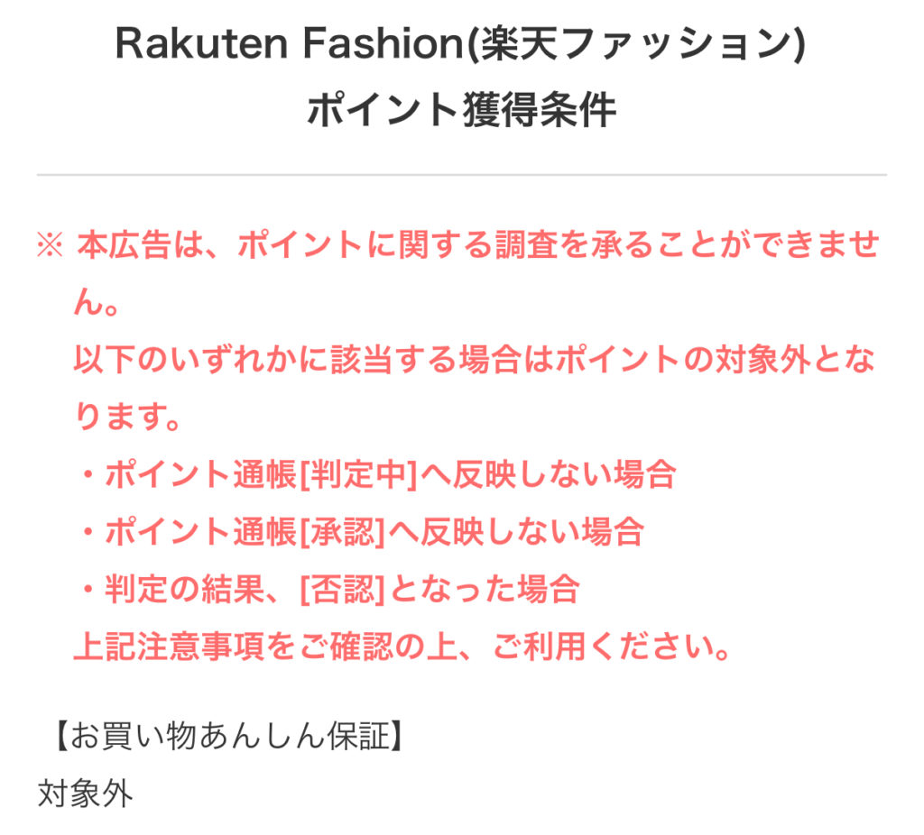 また、モッピーでは楽天ファッションがポイント調査・保証の対象外のため、万が一ポイントがつかなくても問い合わせすらできません。