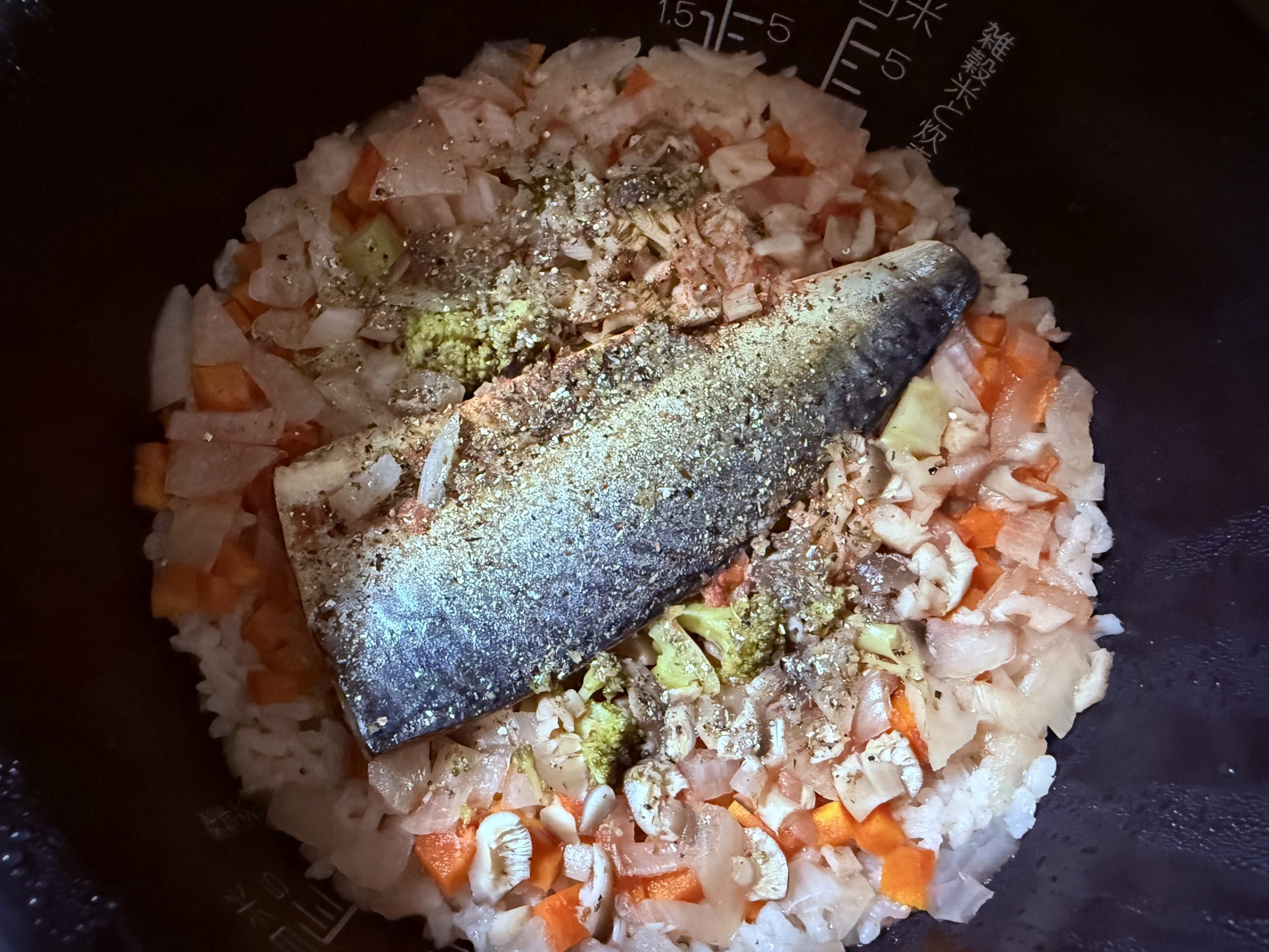お米と水を入れ、みじん切り野菜、骨取りサバ、トマトペースト、お出汁を全部IN!炊飯器のボタンをポチするだけで調理完了です。後ほどほぐすので、みじん切りもこんな感じに超絶に雑で大丈夫です👍